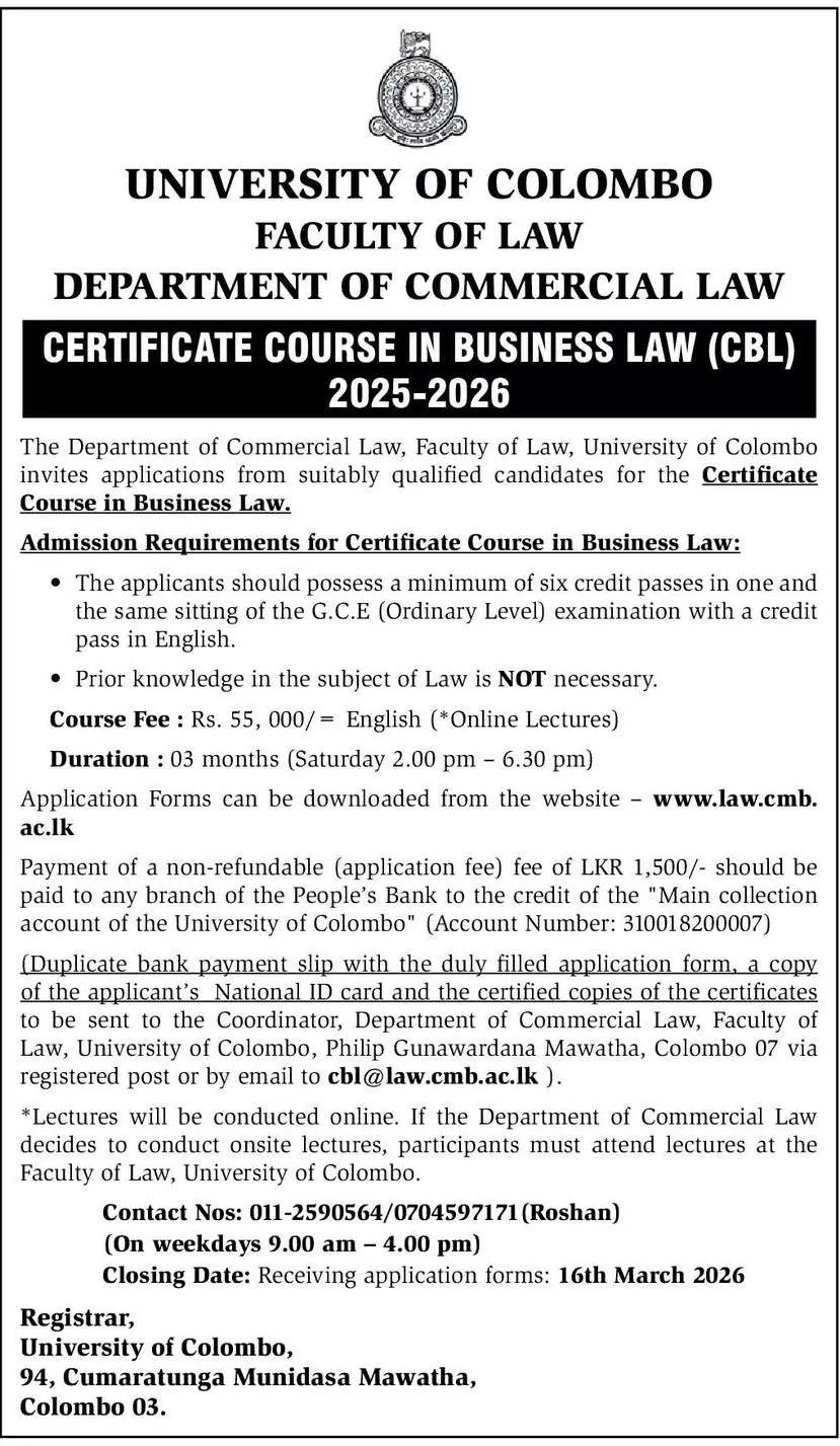 The University of Colombo, through its Faculty of Law – Department of Commercial Law, is inviting applications for the Certificate Course in Business Law (CBL) 2025–2026.