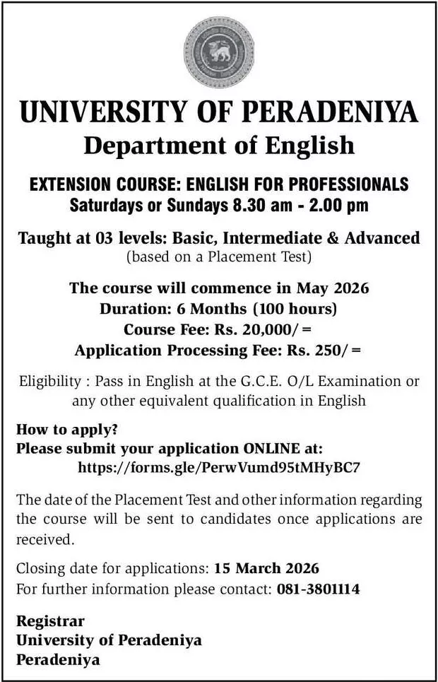 Extension Course: English for Professionals 2026 – Department of English – University of Peradeniya