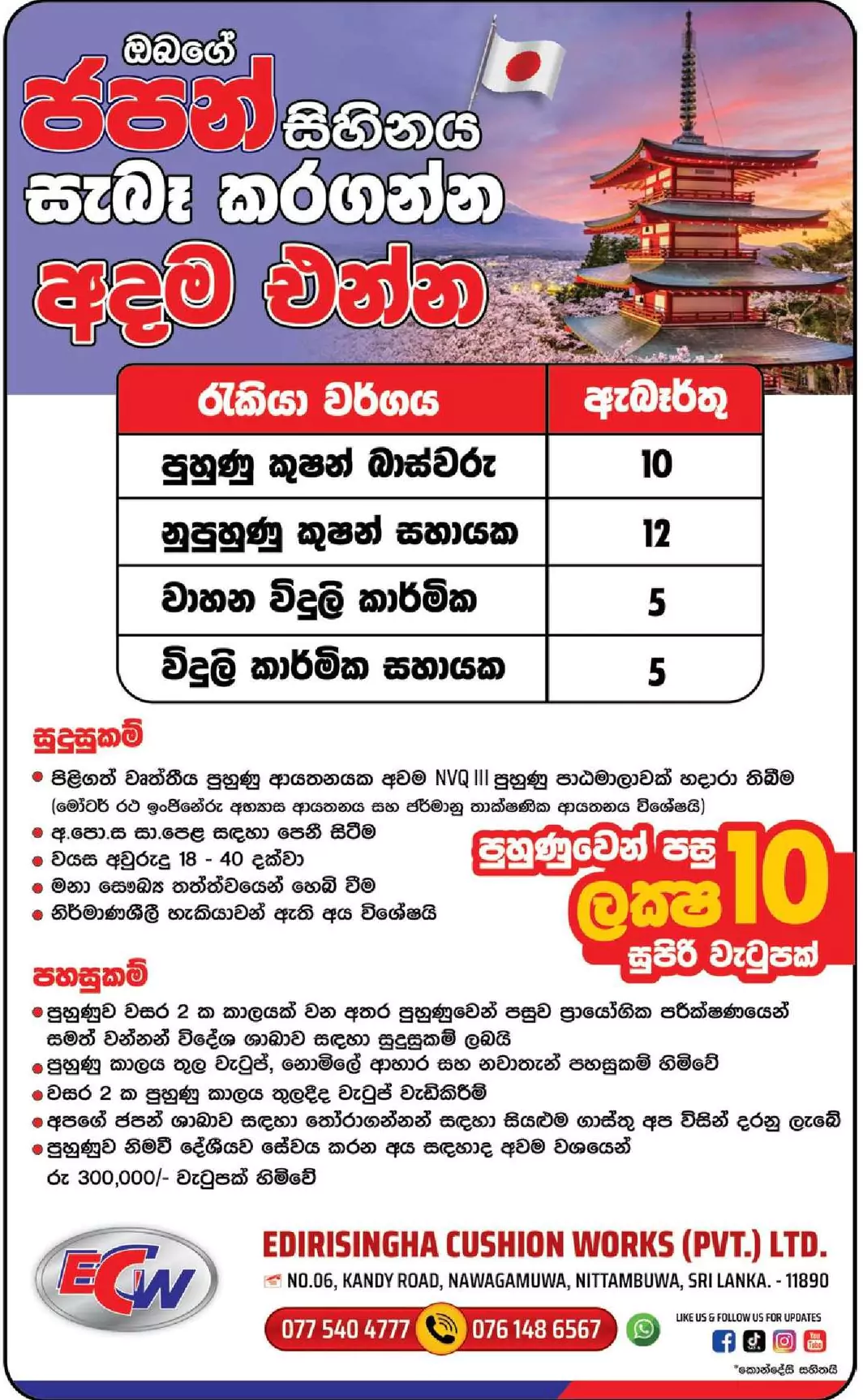 Trained Cushion Bass, Untrained Cushion Assistant, Automotive Electrician, Electrician’s Assistant Vacancies in Japan 2025