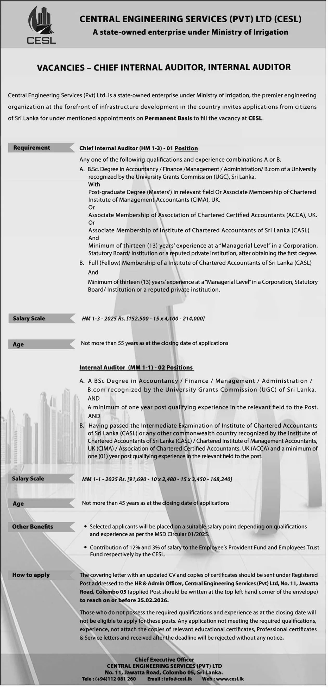 Chief Internal Auditor, Internal Auditor – Central Engineering Services (Pvt) Ltd Vacancies 2026