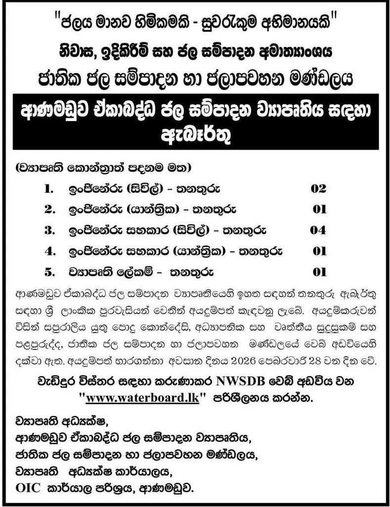 Engineer (Civil), Engineer (Mechanical), Engineering Assistant (Civil), Engineering Assistant (Mechanical), Project Secretary – National Water Supply and Drainage Board (Water Board) Vacancies 2026