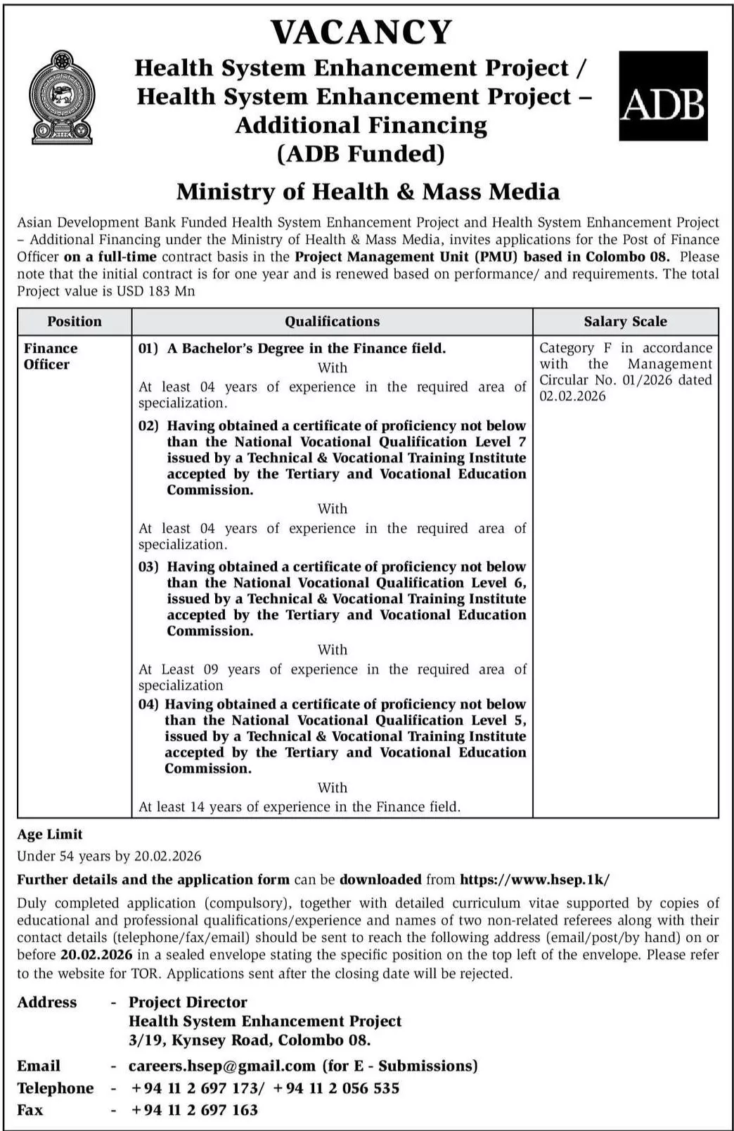 • Finance Officer – Health System Enhancement Project (HSEP) Vacancies 2026