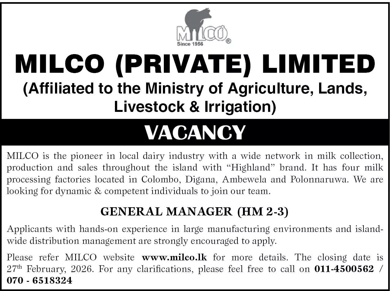 Milco operates an island-wide milk collection, production, and distribution network with processing plants located in Colombo, Digana, Ambewela, and Polonnaruwa. This is a prestigious senior management opportunity in a leading state-affiliated organization.