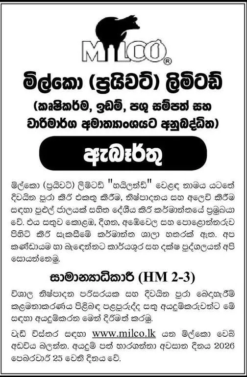 Milco Private Limited, the pioneer of Sri Lanka’s local dairy industry and the proud producer of the Highland brand, invites applications from dynamic and experienced professionals for the post of General Manager (HM 2-3).