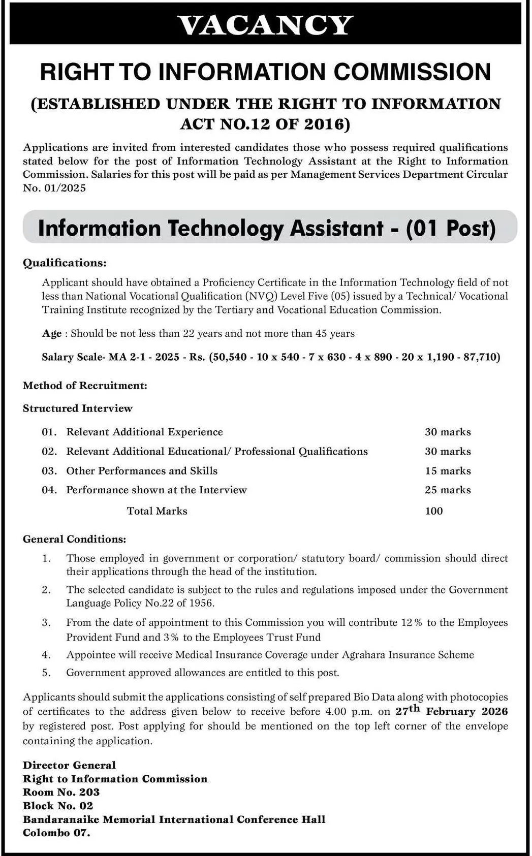 Information Technology Assistant – Right To Information Commission Vacancies 2026