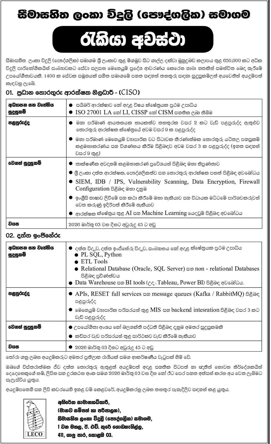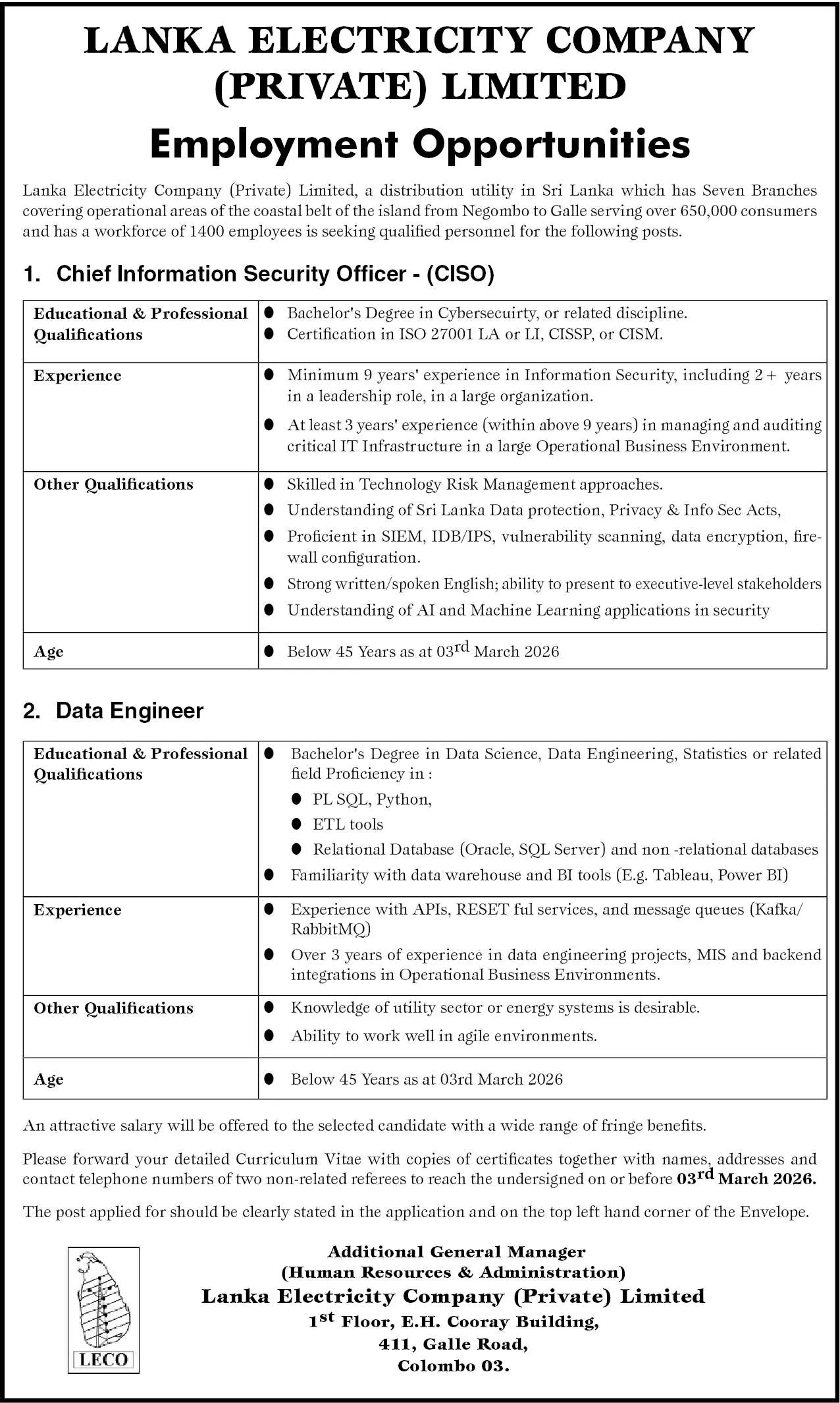 Lanka Electricity Company (Private) Limited Vacancies 2026 – CISO & Data Engineer