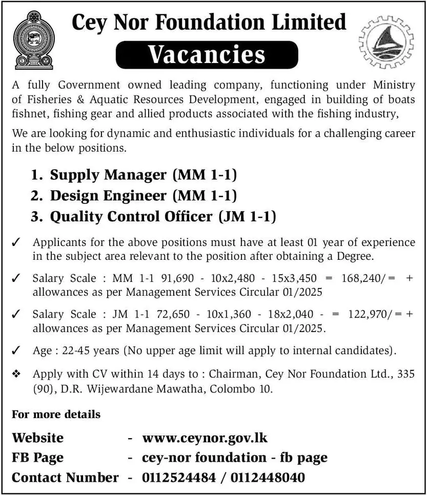 Supply Manager, Design Engineer, Quality Control Officer – Cey-Nor Foundation Limited Vacancies 2025