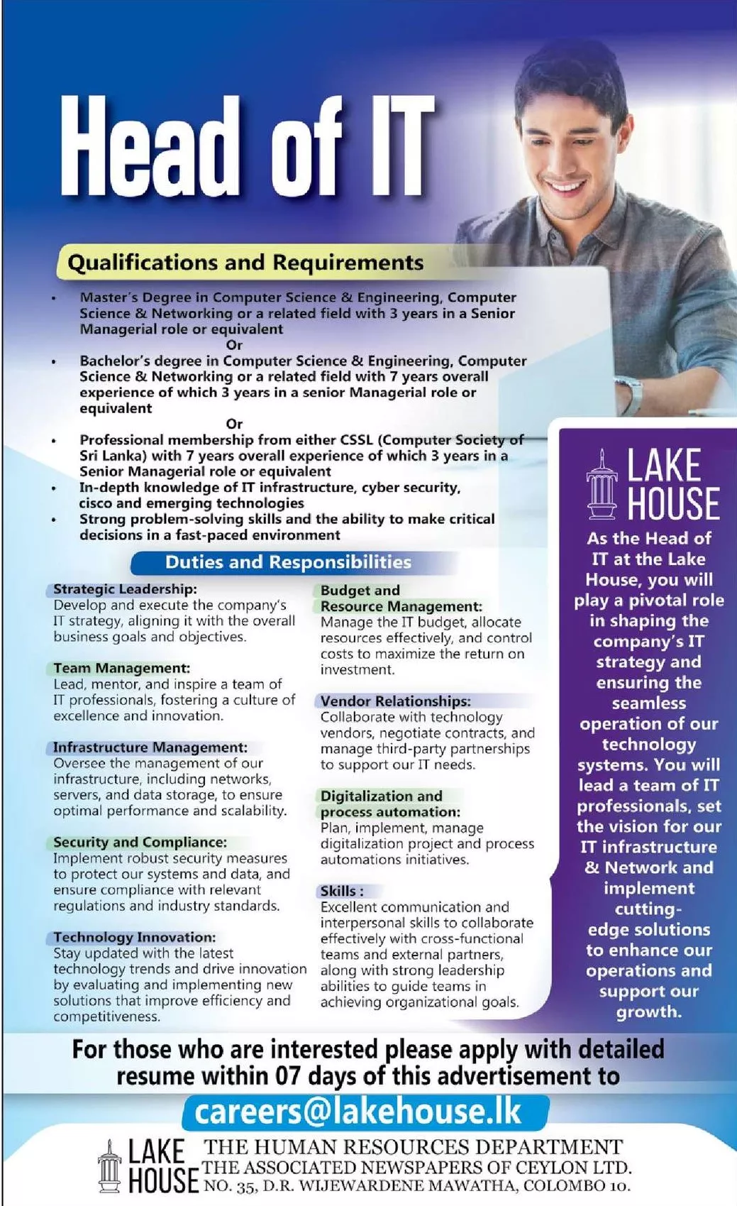Head of IT – The Associated Newspapers of Ceylon Limited (Lake House) Vacancies 2025