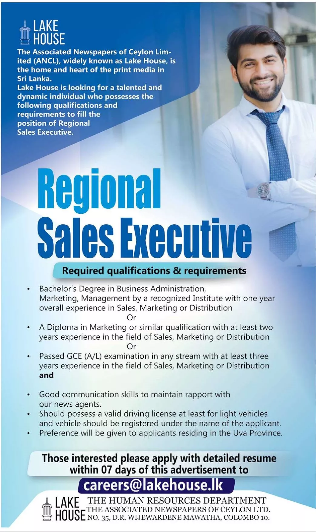 Regional Sales Executive – The Associated Newspapers of Ceylon Limited (Lake House) Vacancies 2025