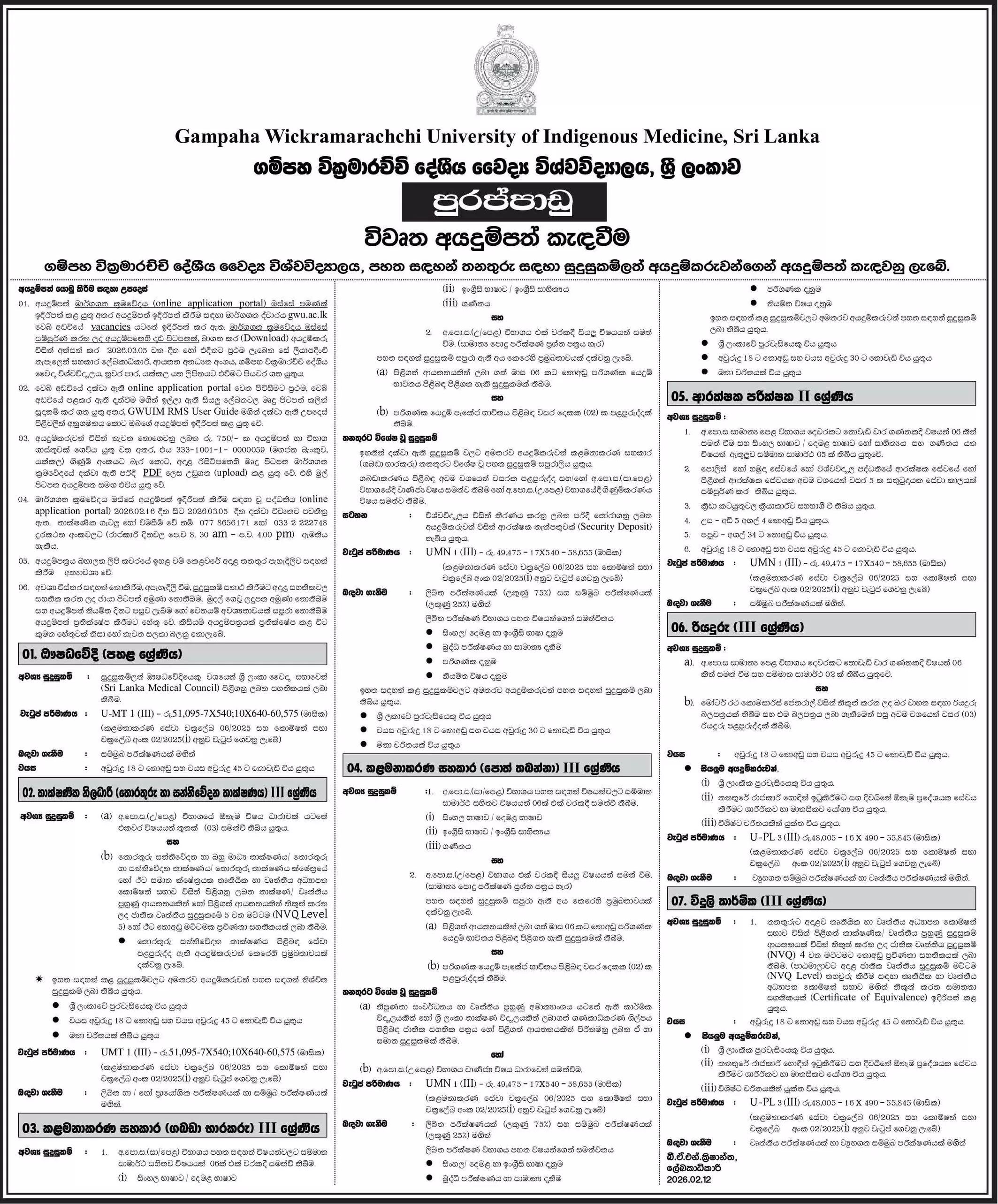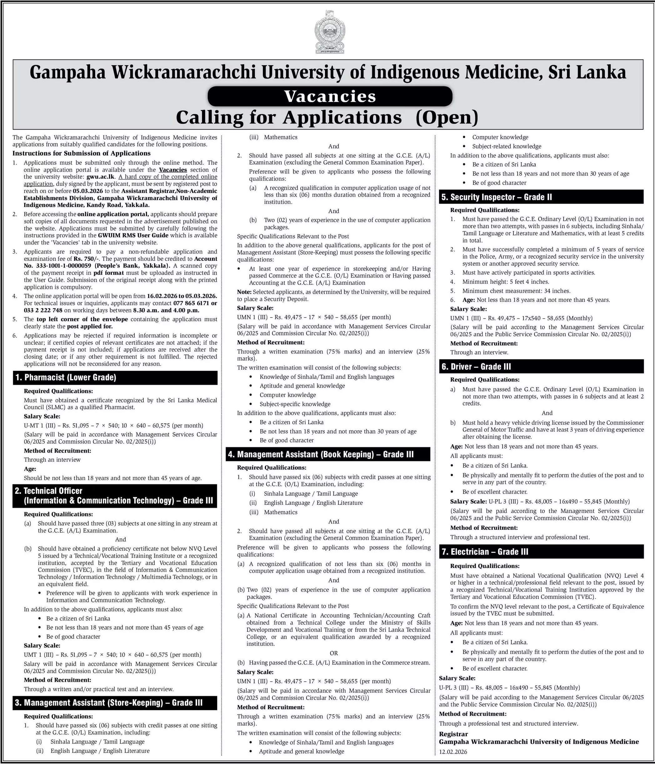 Pharmacist, Technical Officer, Management Assistant (Store Keeping), Management Assistant (Book Keeping), Security Inspector, Driver, Electrician – Gampaha Wickramarachchi University of Indigenous Medicine Vacancies 2026