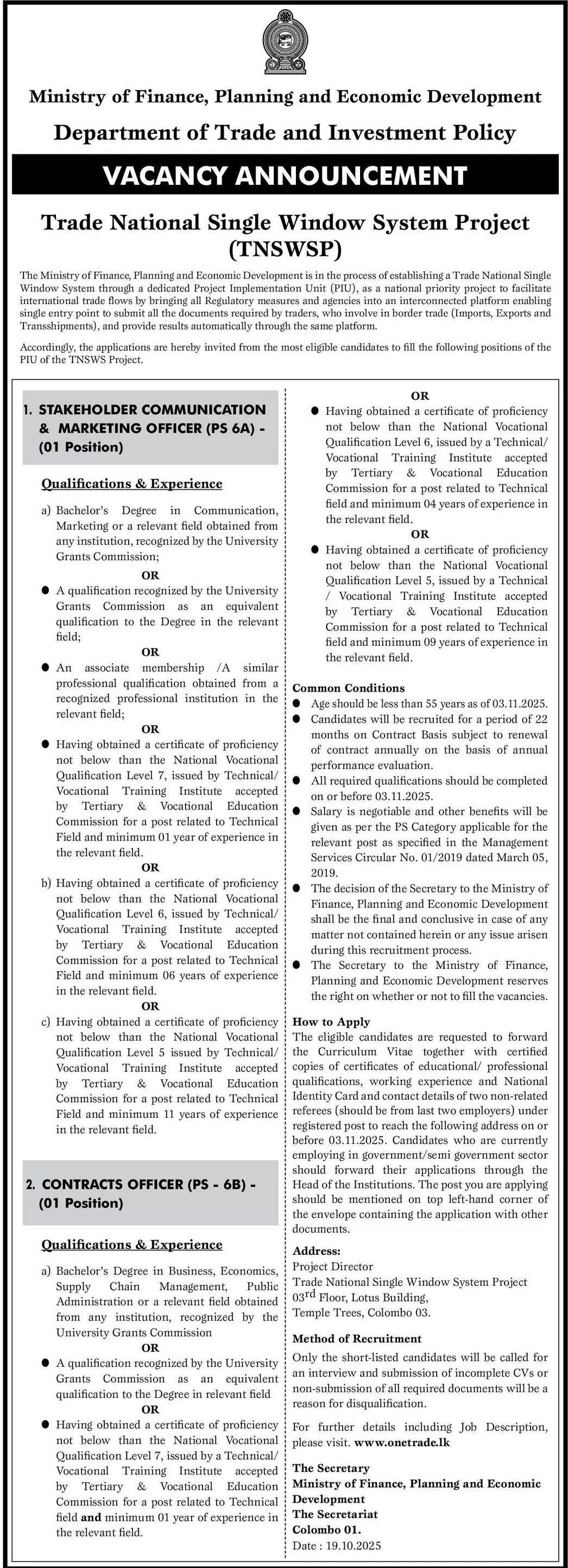 Government Job Vacancies in Sri LankaTrade National Single Window System Project (TNSWSP) Vacancies