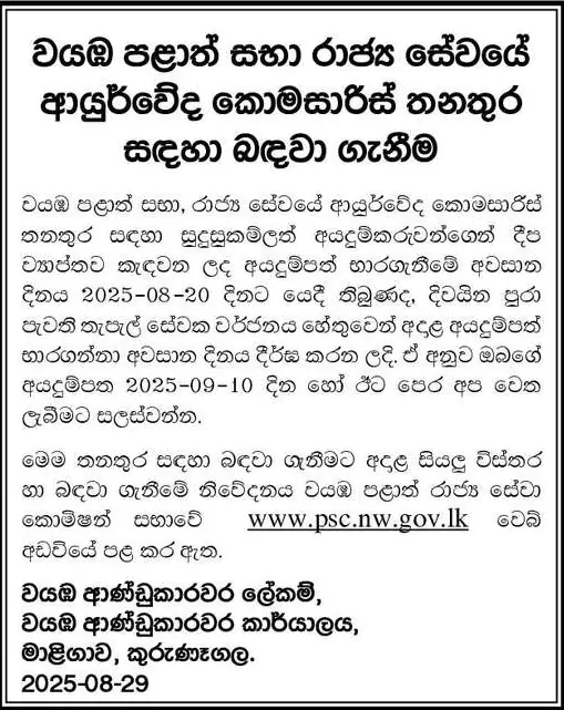Ayurvedic Commissioner – North Western Provincial Council Vacancies 2025