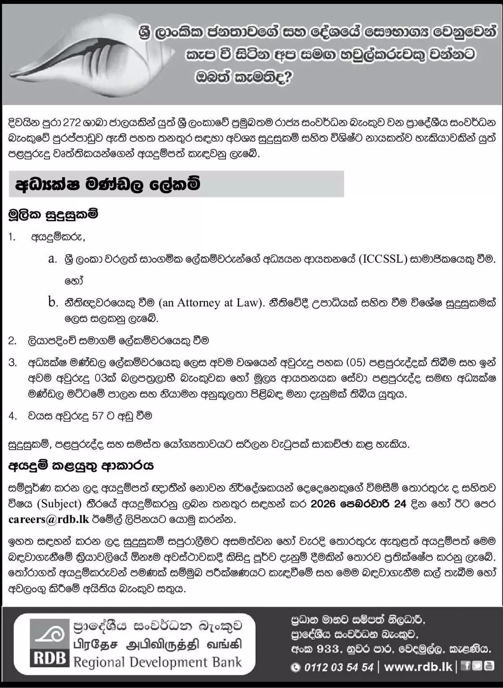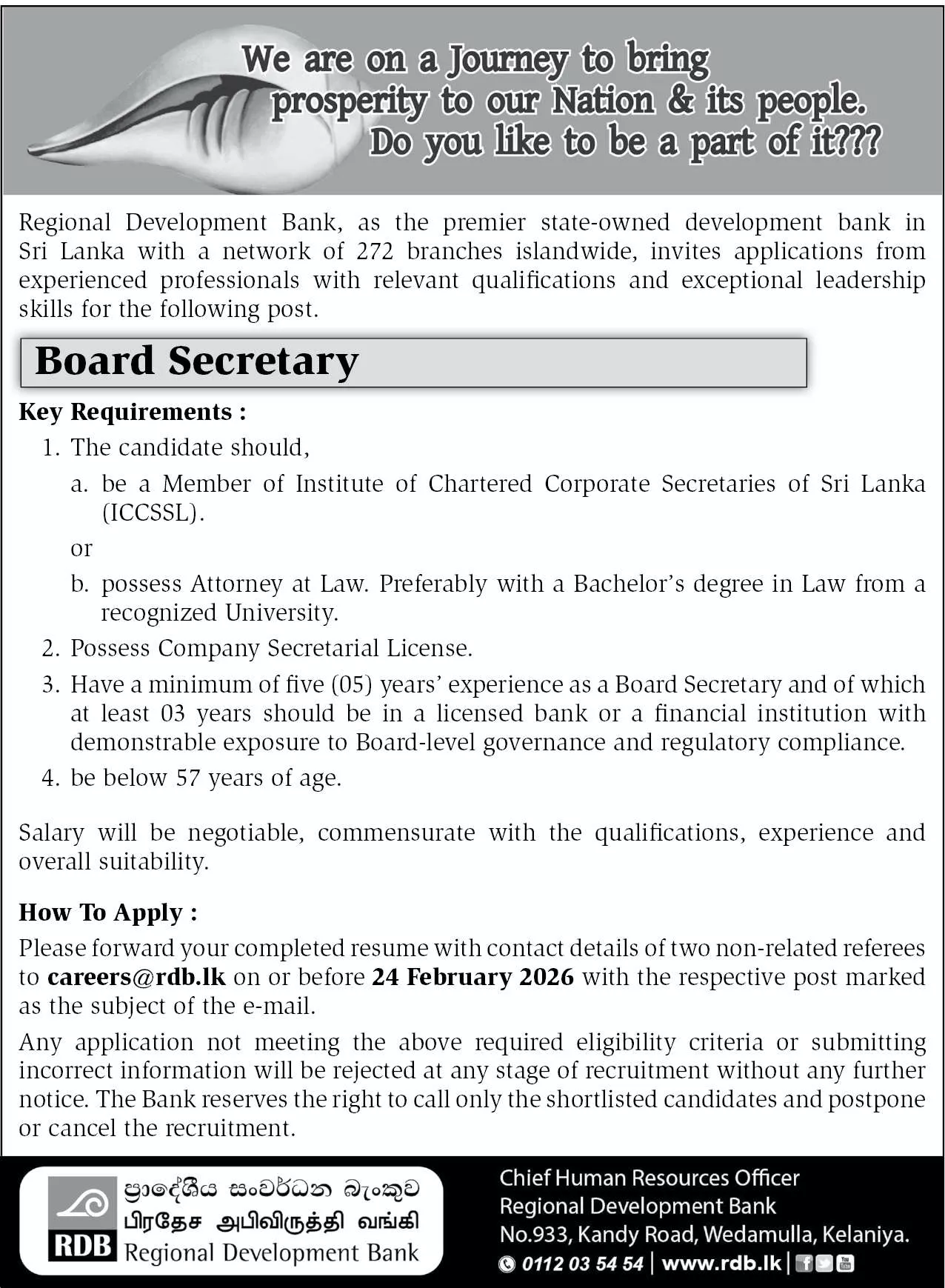 The Regional Development Bank (RDB) invites applications from experienced and qualified professionals for the post of Board Secretary.