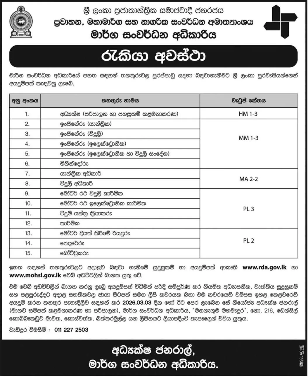 Government Job Vacancies in Sri LankaRoad Development Authority (RDA) Vacancies