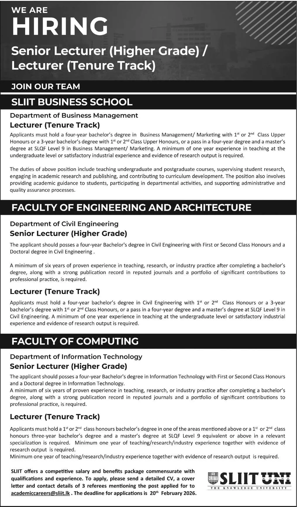 Senior Lecturer (Higher Grade), Lecturer (Tenure Track) – Sri Lanka Institute of Information Technology (SLIIT) Vacancies 2026