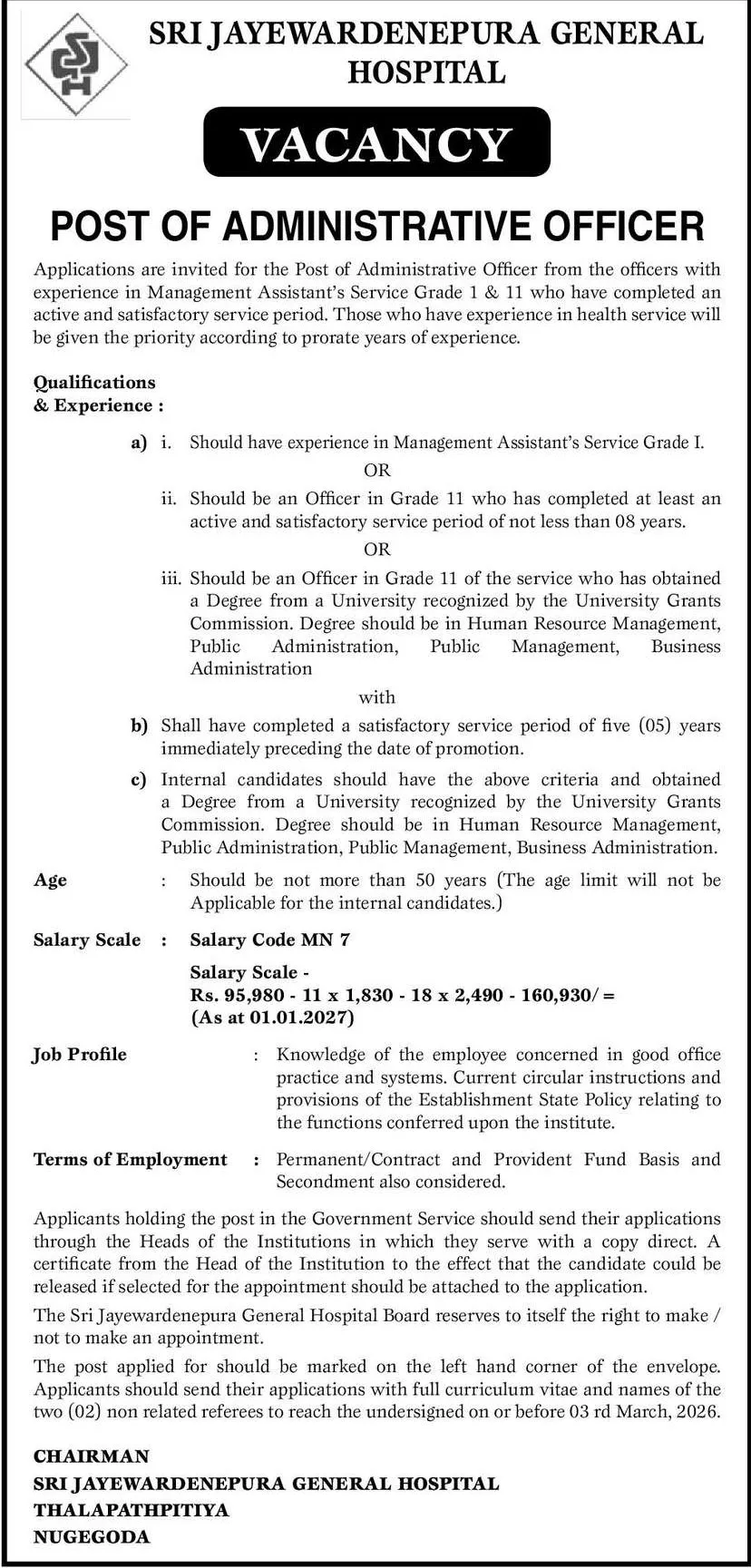 The Sri Jayewardenepura General Hospital has officially announced a vacancy for the Post of Administrative Officer. Applications are invited from eligible officers in the Management Assistant’s Service who meet the required qualifications and experience.