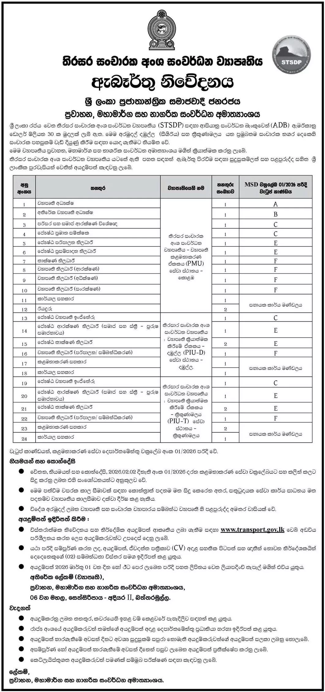The Ministry of Transport, Highways and Urban Development invites applications from suitably qualified and experienced Sri Lankan citizens for multiple vacancies under the Sustainable Tourism Sector Development Project (STSDP).