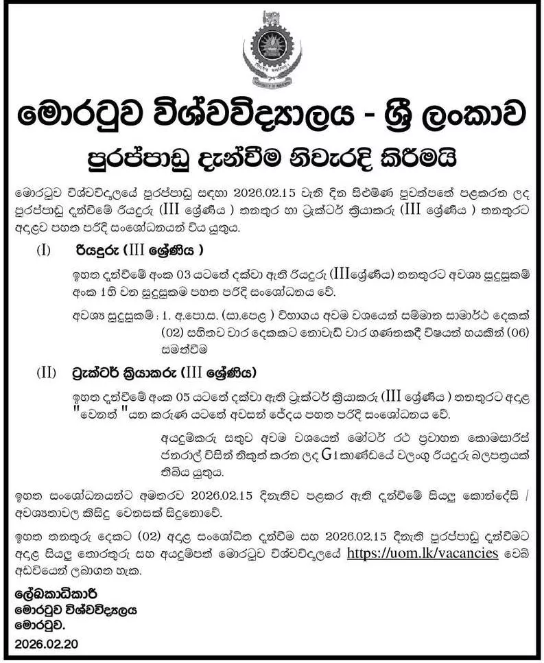 The University of Moratuwa invites applications from suitably qualified persons for several Non-Academic Staff Vacancies 2026.
