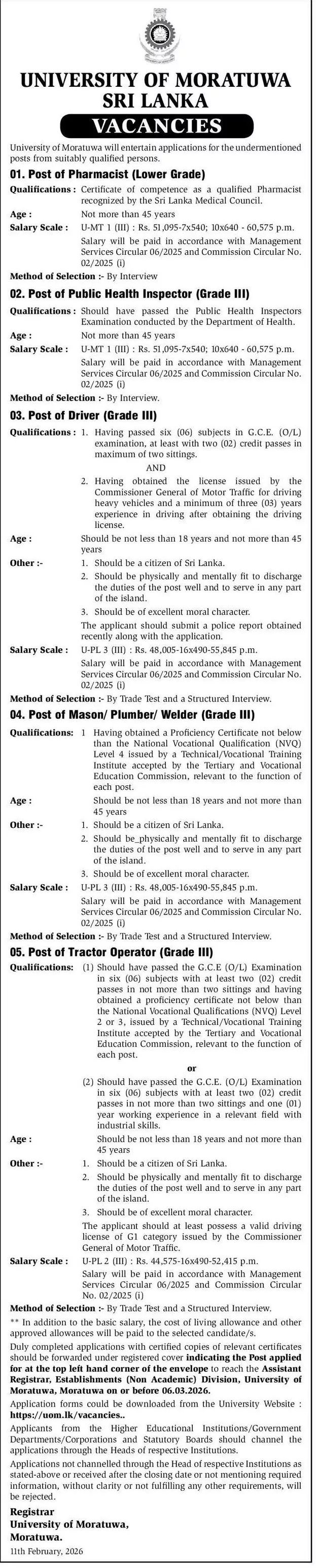 University of Moratuwa Vacancies 2026 – Pharmacist, PHI, Driver & More
