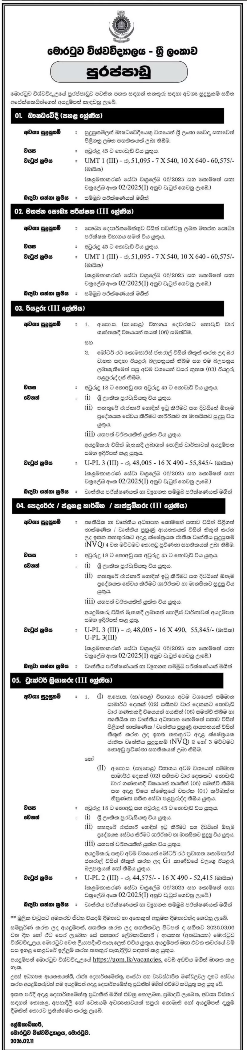 The University of Moratuwa invites applications from suitably qualified persons for several Non-Academic Staff Vacancies 2026.