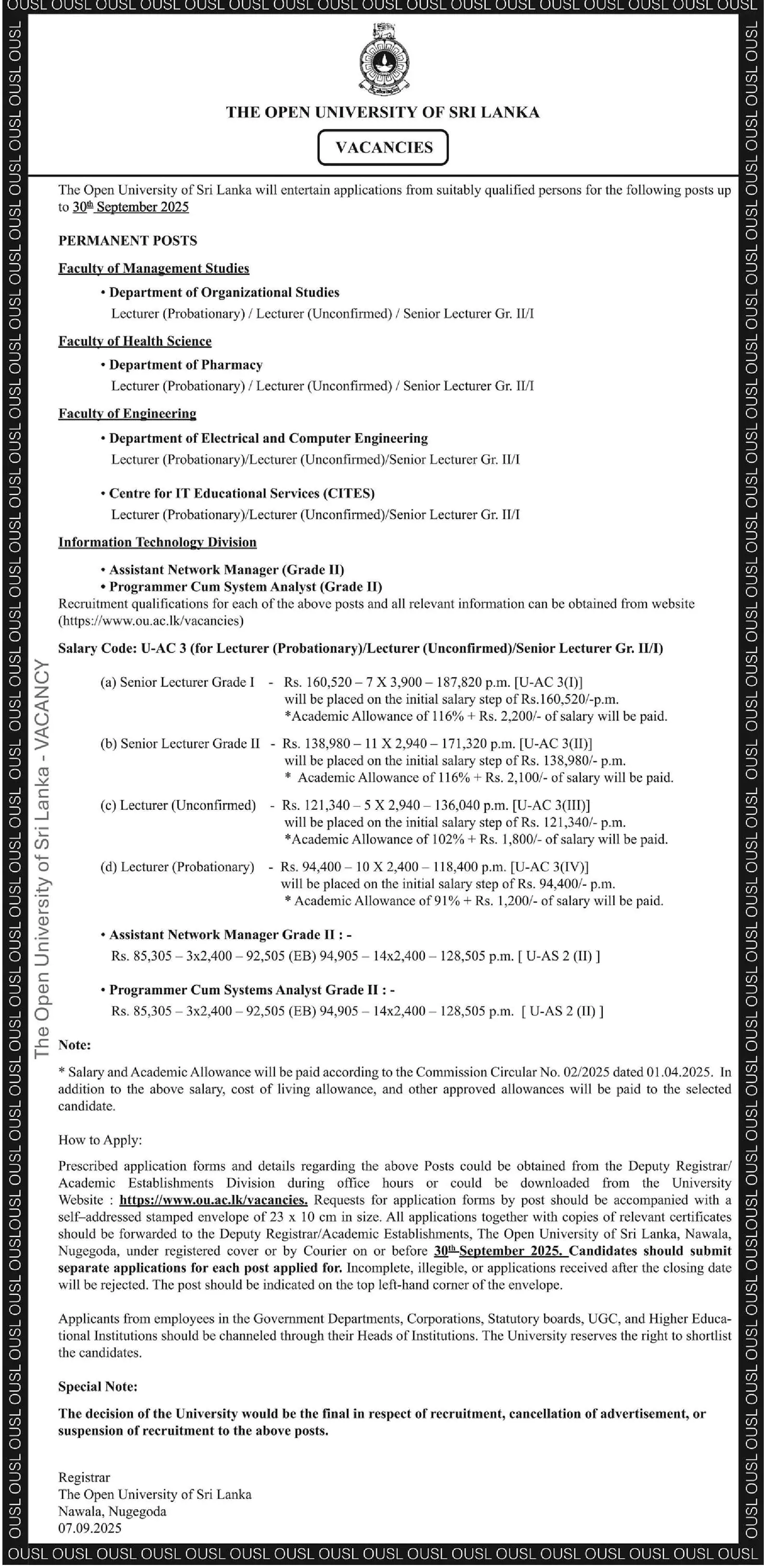 Senior Lecturer (Grade I/II), Lecturer (Unconfirmed), Lecturer (Probationary), Assistant Network Manager, Program cum Systems Analyst – Open University of Sri Lanka (OUSL) Vacancies 2025