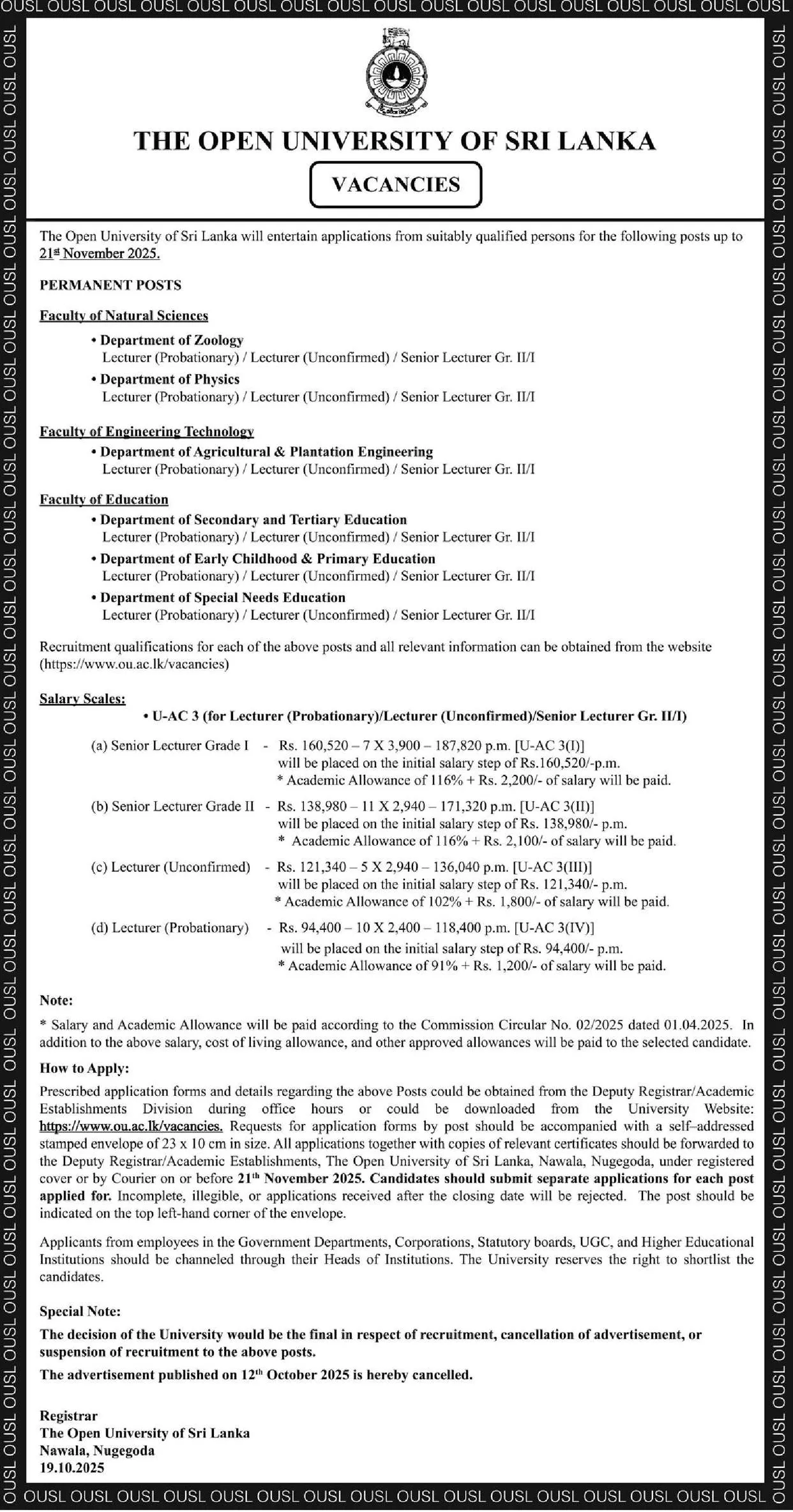 Senior Lecturer (Grade I/II), Lecturer (Unconfirmed), Lecturer (Probationary) – Open University of Sri Lanka (OUSL) Vacancies 2025