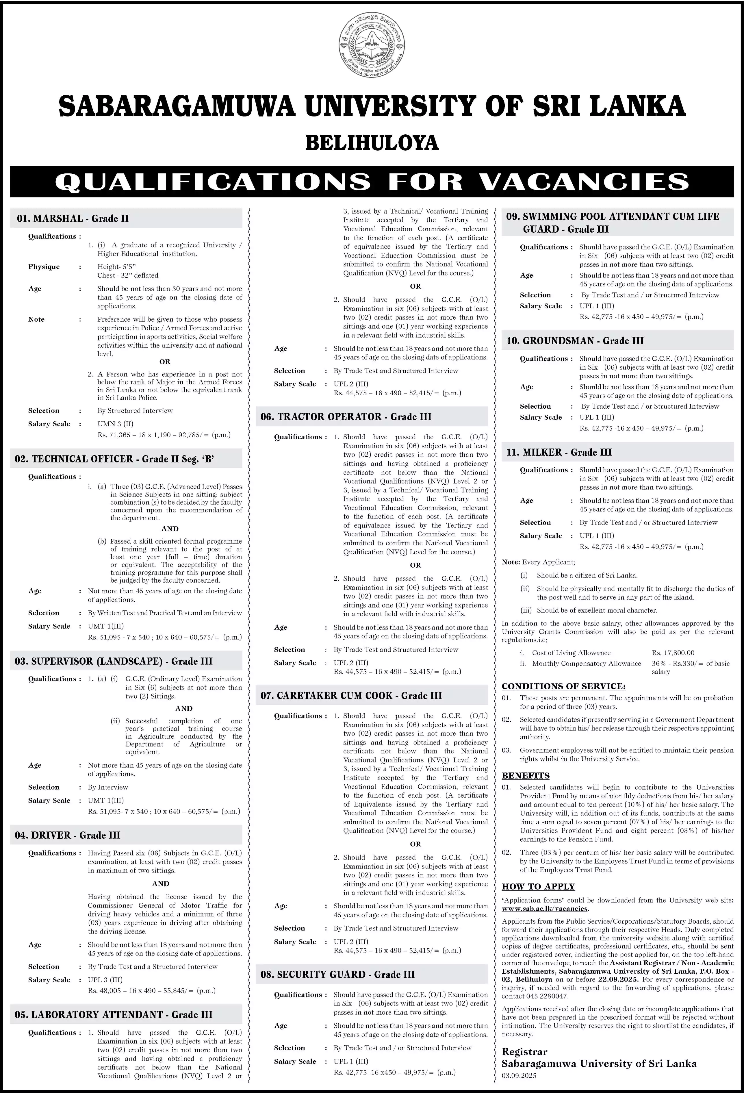 Marshal, Technical Officer, Supervisor (Landscape), Driver, Laboratory Attendant, Tractor Operator, Caretaker Cum Cook, Security Guard, Swimming Pool Attendant Cum Life Guard, Groundsman, Milker – Sabaragamuwa University of Sri Lanka Vacancies 2025