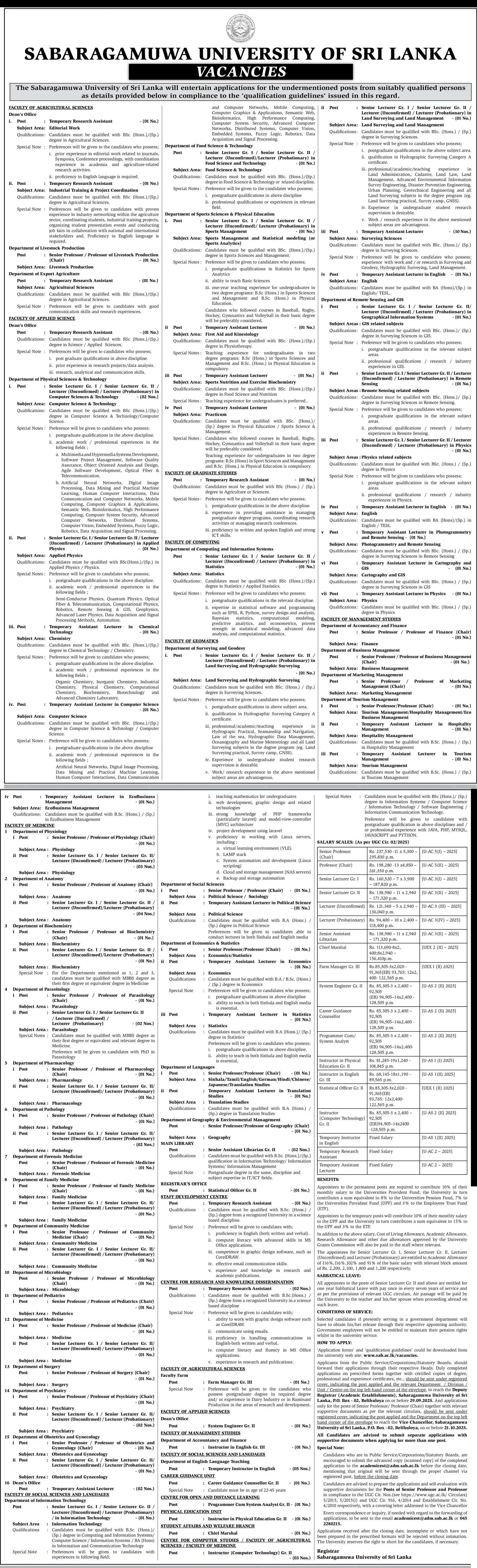 Temporary Research Assistant, Senior Professor, Professor, Senior Lecturer (Grade I/II), Lecturer (Unconfirmed), Lecturer (Probationary), Temporary Assistant Lecturer, Senior Assistant Librarian, Chief Marshal, Farm Manager, System Engineer, Career Guidance Counsellor, Program cum System Analyst, Instructor, Statistical Officer, Instructor, Temporary Instructor – Sabaragamuwa University of Sri Lanka Vacancies 2025