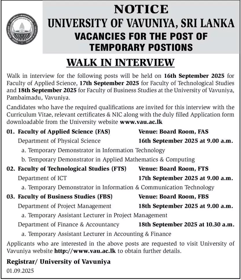 Temporary Demonstrator, Temporary Assistant Lecturer – University of Vavuniya Vacancies 2025