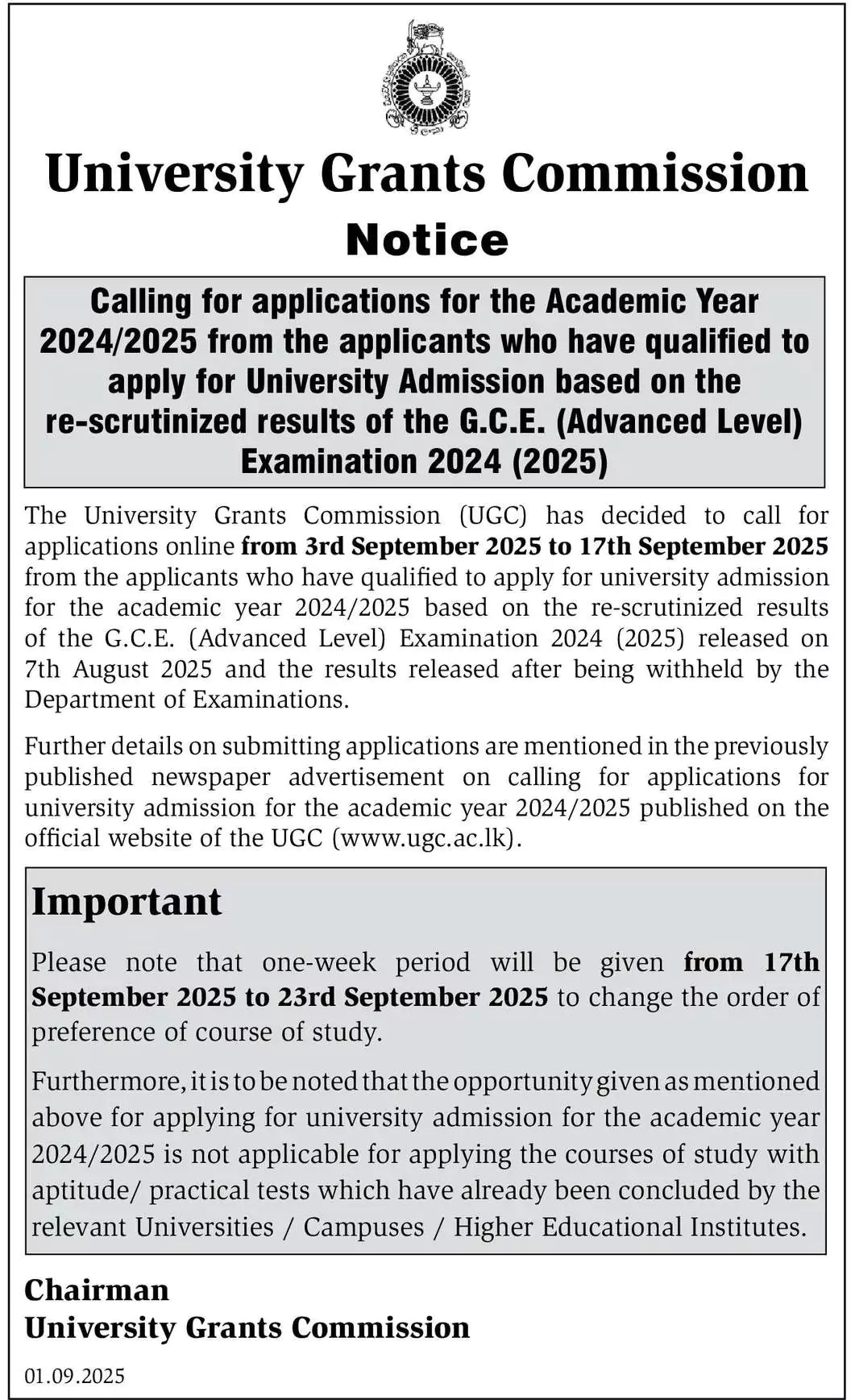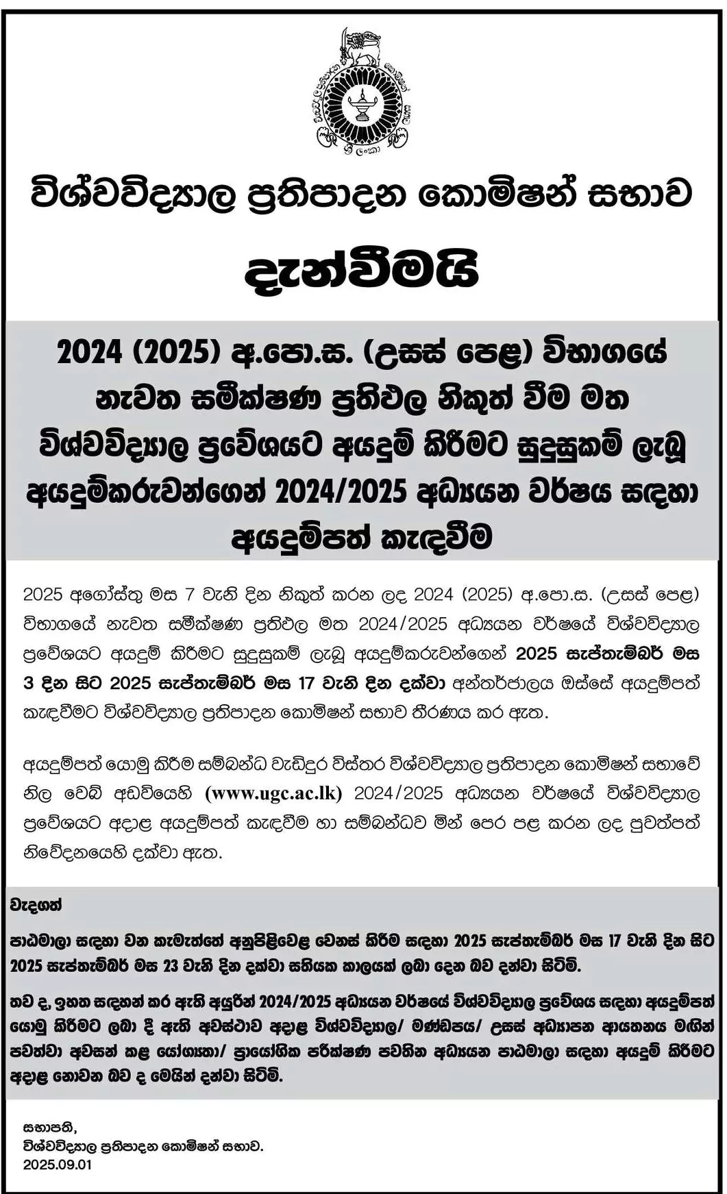 Calling for Applications for the Academic Year 2024/2025 from the Applicants who have qualified to apply for University Admission based on the re-scrutinized results of the G.C.E. (Advanced Level) Examination 2024 (2025)